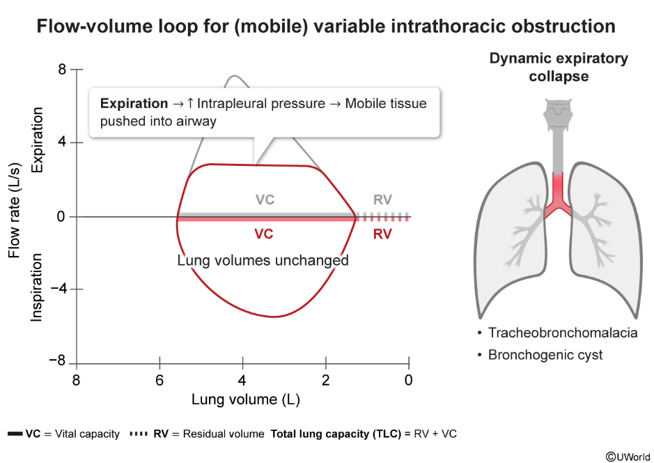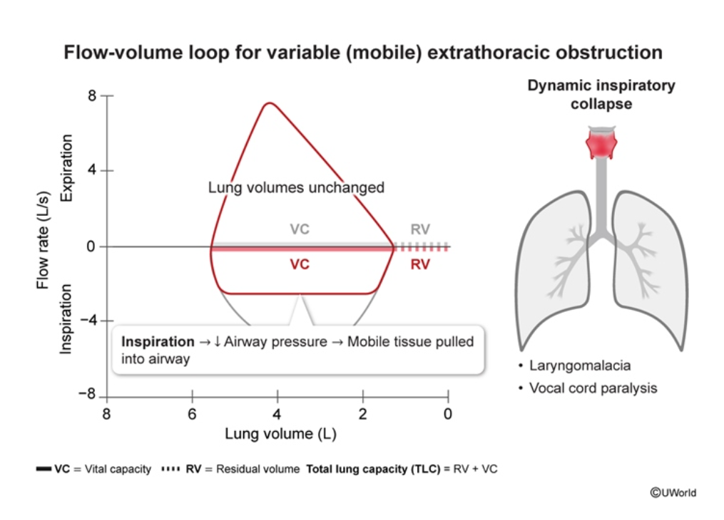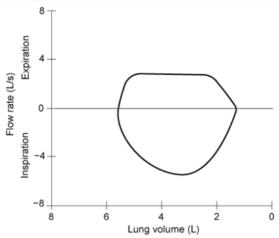 evidence of variable obstruction (mobile). Inspiration volume normal, expiratory volume blunted/uniform expiratory flattening. Can be caused by chronic irritation as in smoking or GERD or prior injury like prolonged intubation.