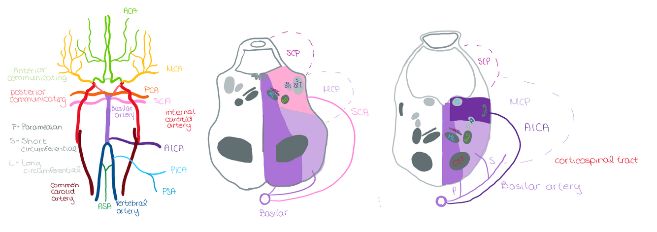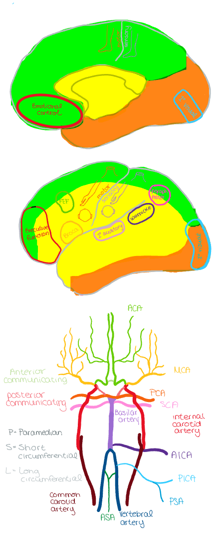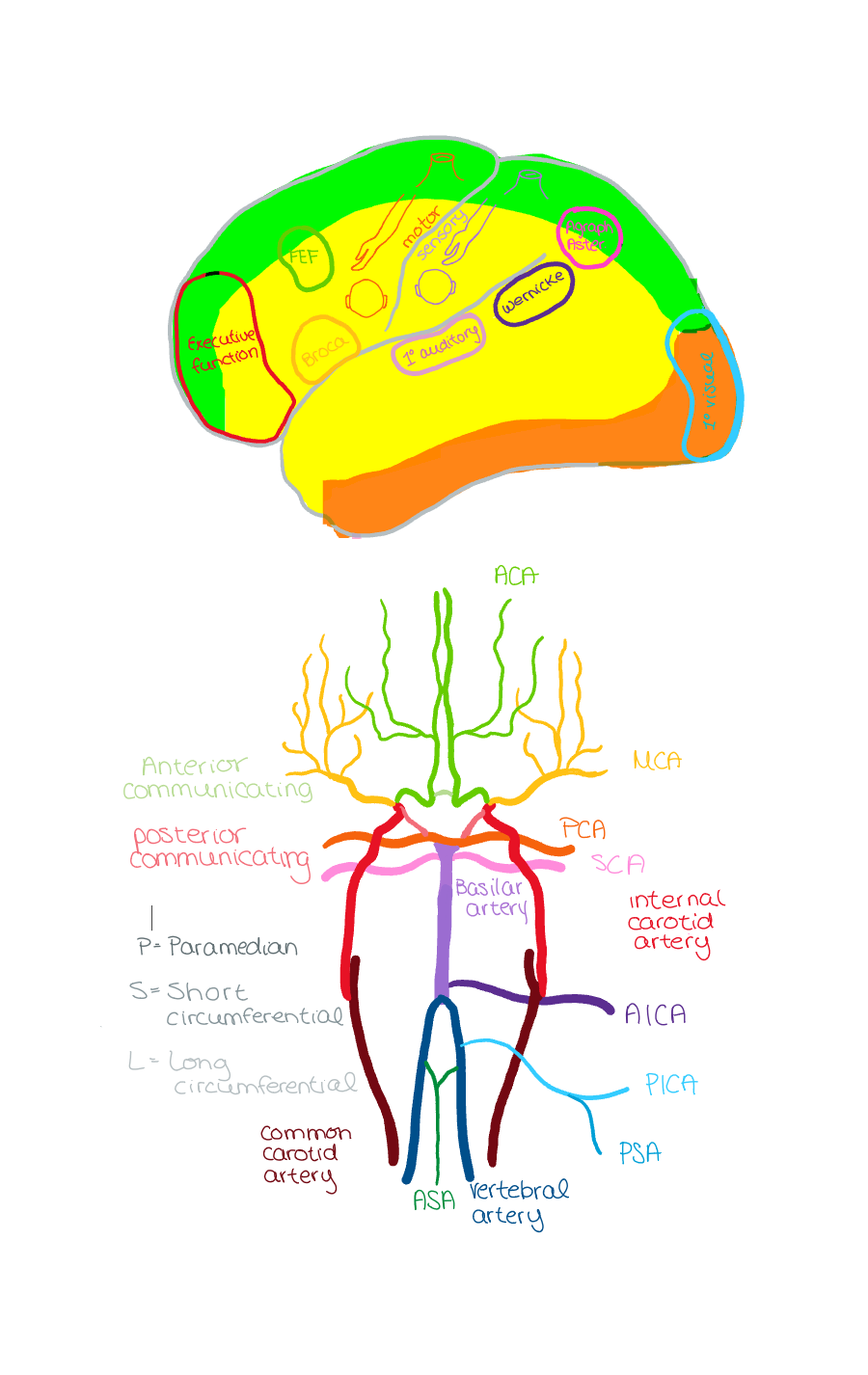 Cortical areas are supplied by larger vessels that are affected by thrombosis and emboli. Subcortical areas are supplied by smaller vessels that are affected by hypertension and diabetes that lead to lipohyalinosis.