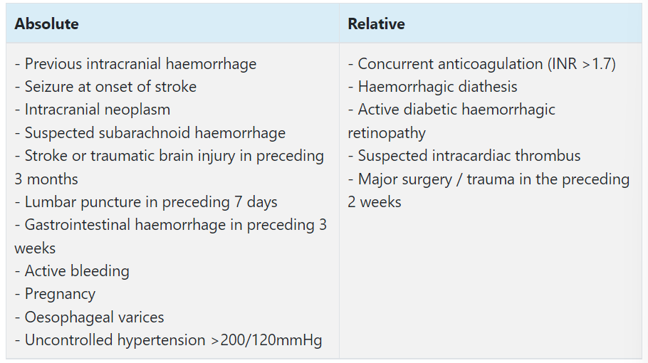 List some contraindications to thrombolysis.
