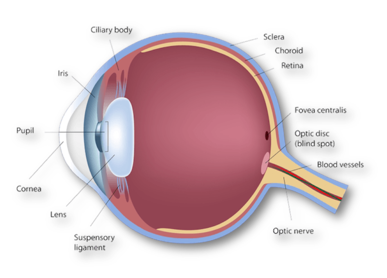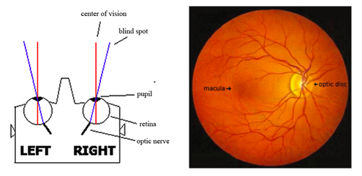 NOTE: With both eyes open, we don’t notice the blind spots becuase the other eye compensates for that part of the visual field