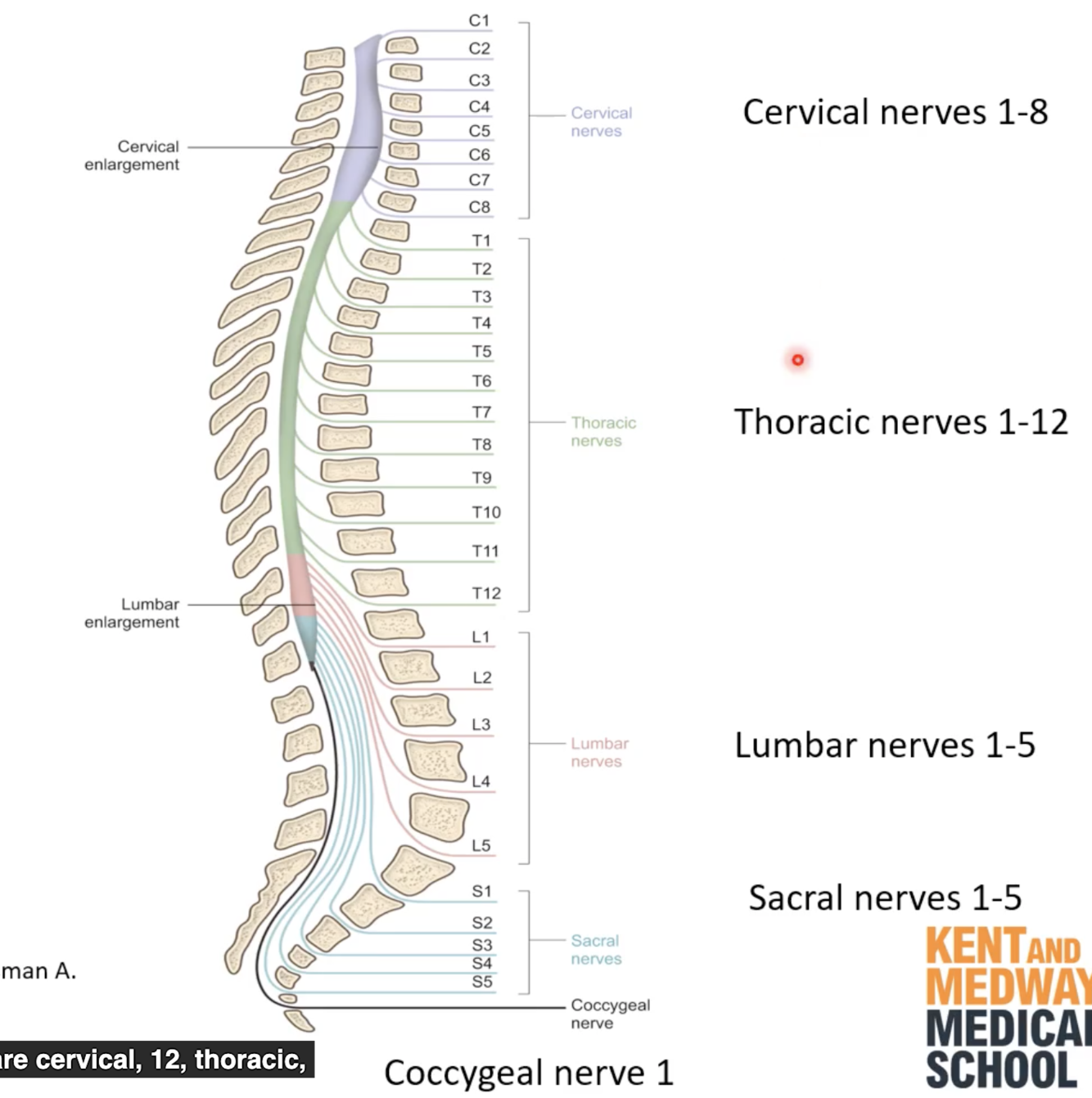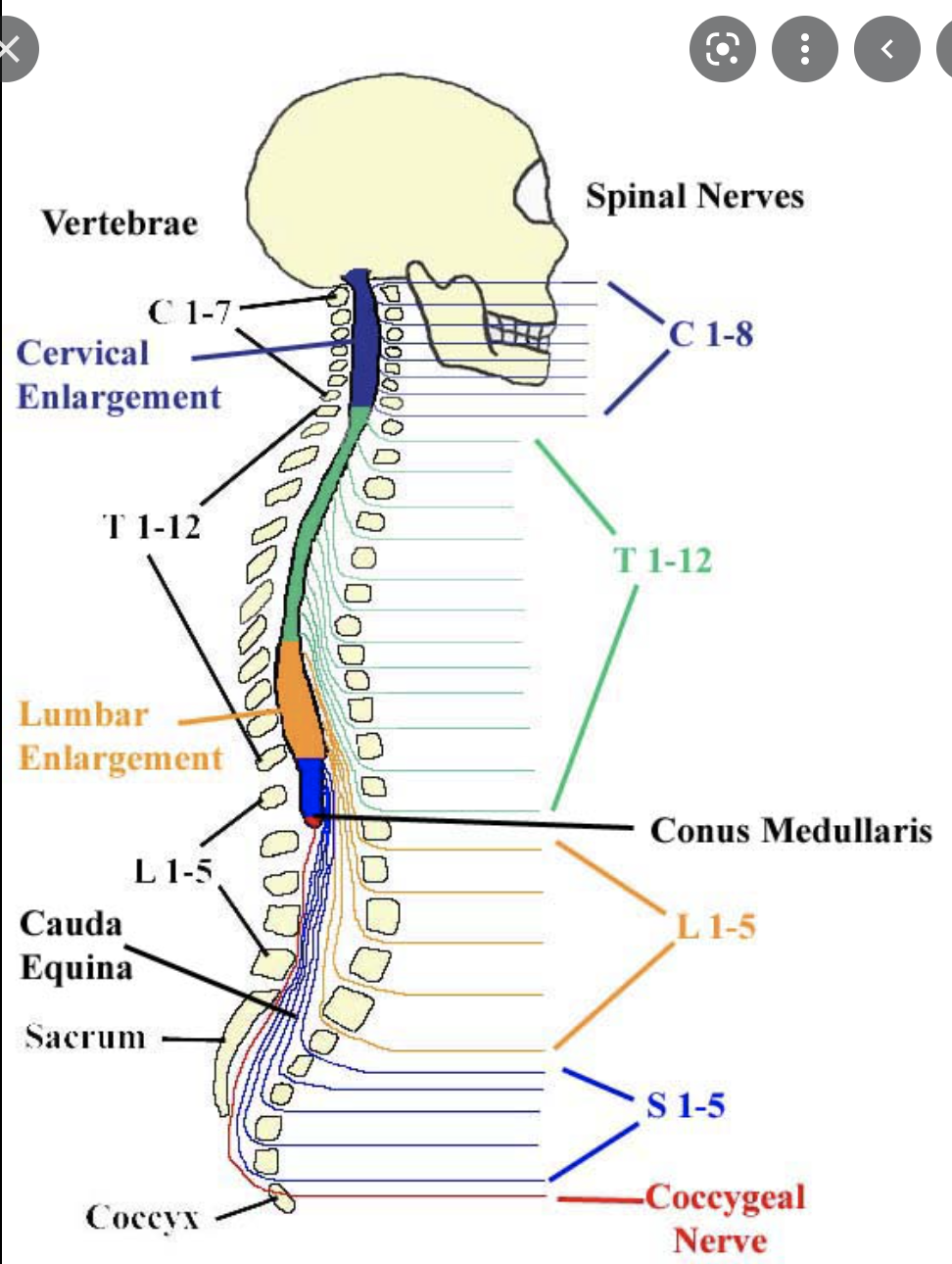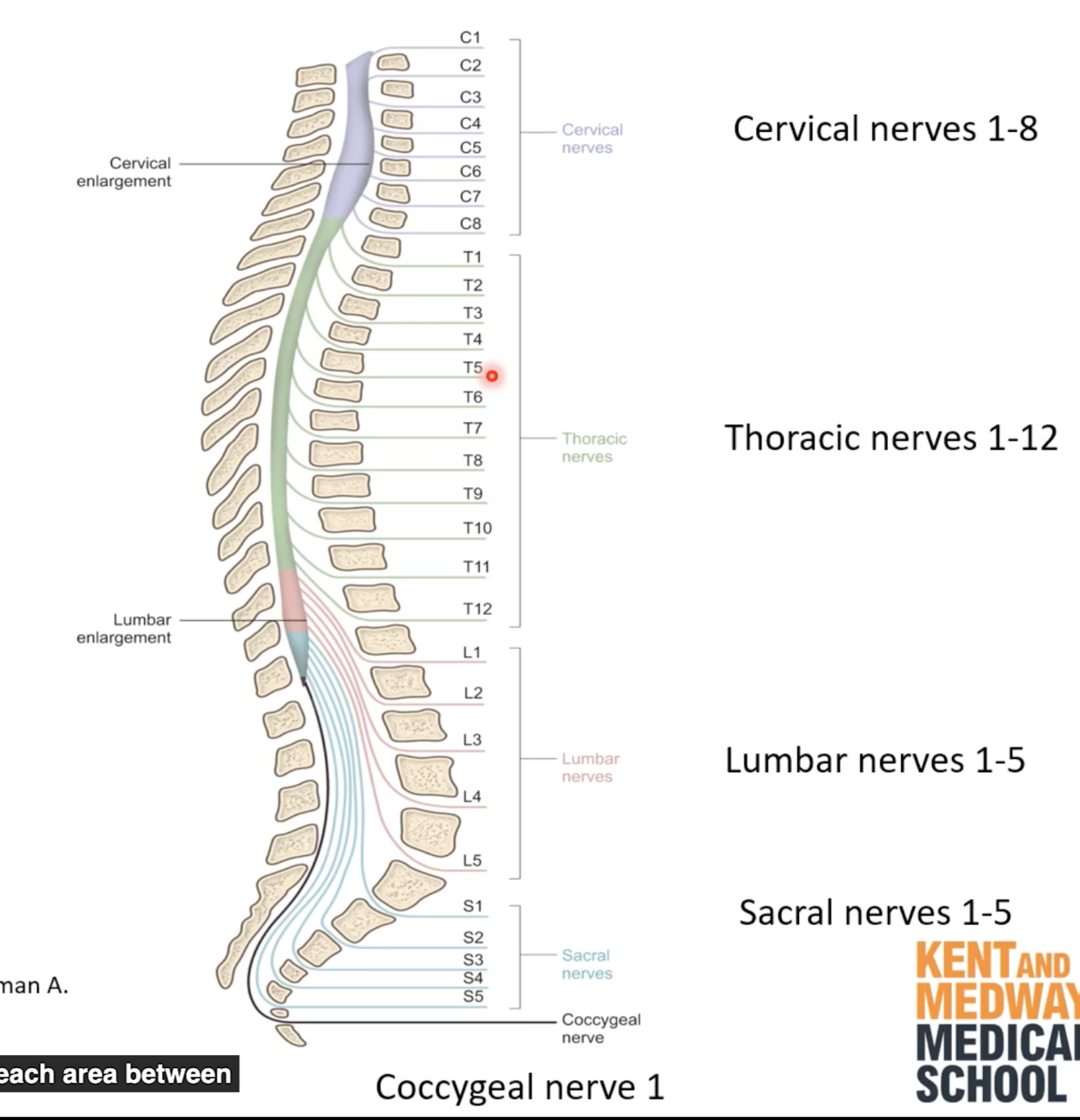 What are the 4 main regions of the spine and how many vertebrae and nerves is contained within each, given that there are 31 spinal nerves in total.