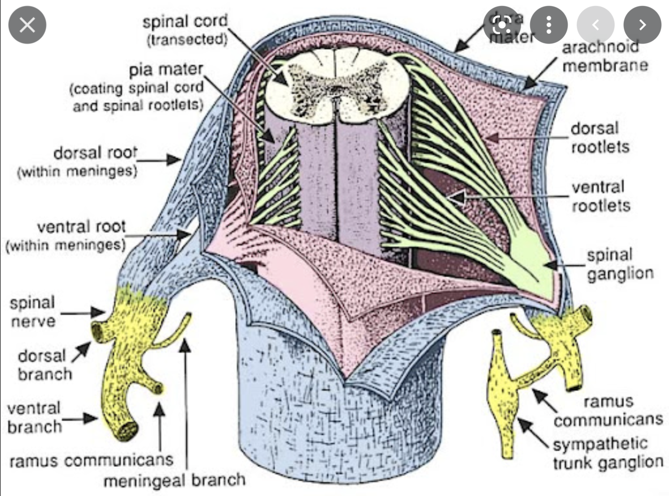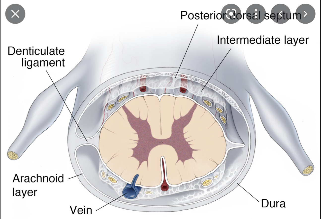 The spinal cord, like the brain has 3 meningel layers. Label these 3 layers in the image below?