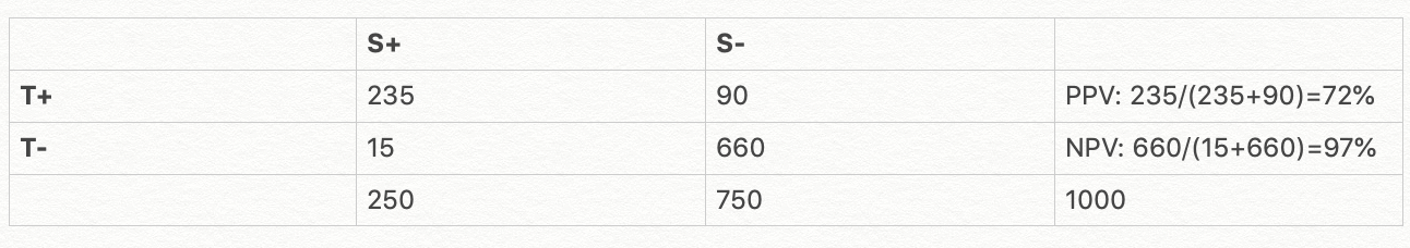 To forskellige test afprøves i almen praksis hvor forekomsten af den sygdom, der skal testes for er 22%. Test A har en sensitivitet på 98% og en specificitet på 92%. (spørgsmål 5) Test B har en sensitivitet på 92% og en specificitet på 98%. (spørgsmål 6)