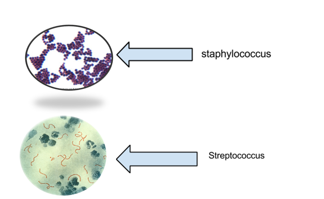 1) By their morphology. Staphylococcus forms clusters of grape like shapes. While Streptococcus forms chains of “pearl necklaces.”