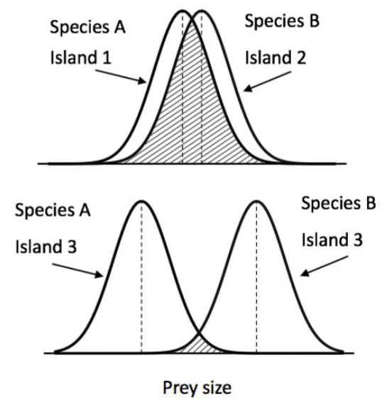 Species A and B are lizards that eat insects. The figures at right show the preferred prey size of each species for populations living on Islands 1, 2, and 3.