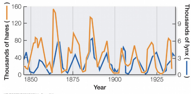 The figure below shows the population size of hares in orange and lynx in blue in northern Canada from 1840-1940