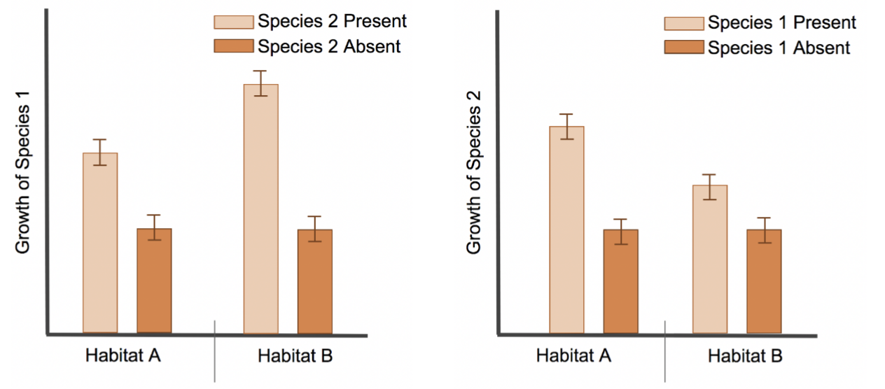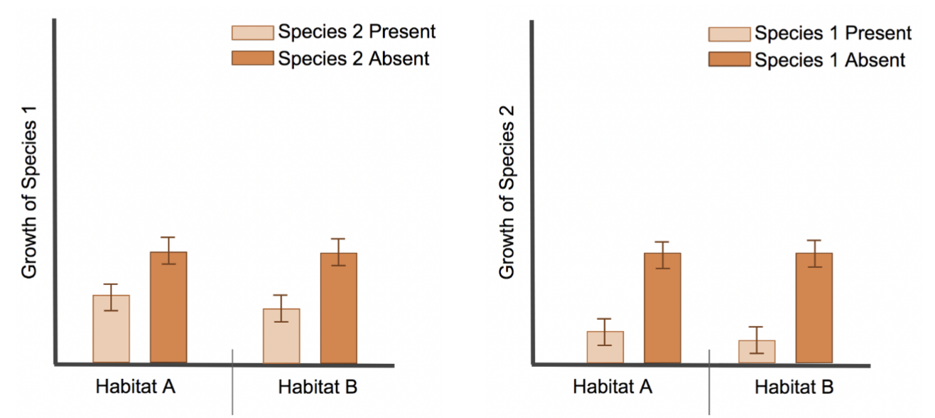 The graphs below show growth of Species 1 in Habitats A and B when Species 2 is present and