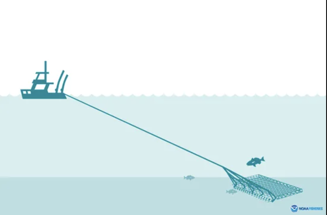 A type of fishing net that’s pulled along the seafloor. Dragging heavy gear across the seabed can also damage sensitive seafloor habitat. Problem: bycatch. Solutions: Changing the size of the mesh to catch adult fish not juveniles. Using square meshes which do not close when the net is towed. This will allow non-target species to escape.