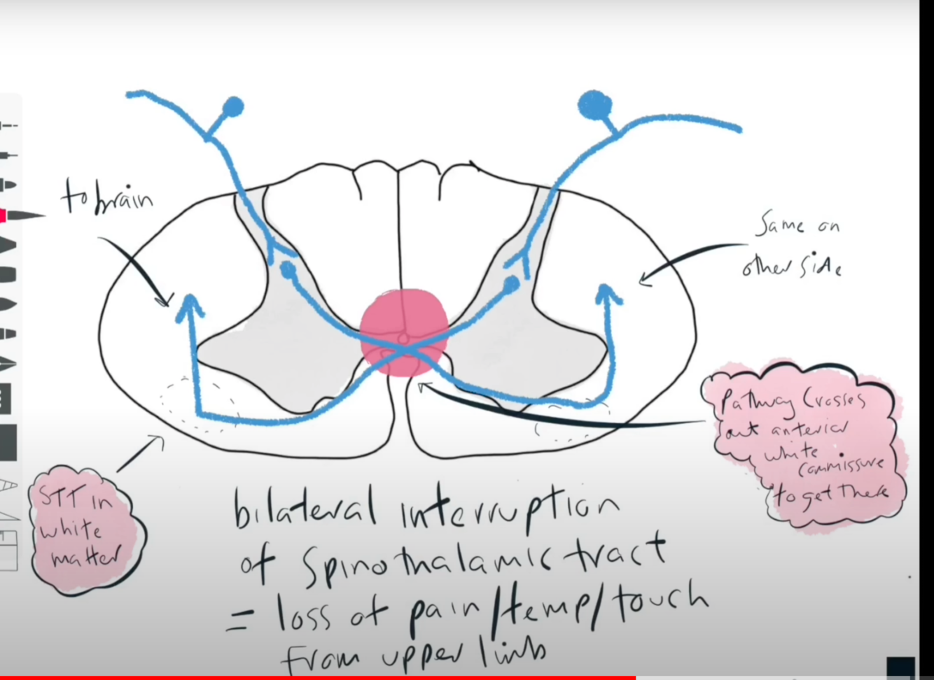 Spinothalamic fibres cross immediately in the cord and cross the anterior white commissure near the central canal. So as the syrinx expands from the central canal it interrupts ST sending (pain, temp etc) fibres across the spinal cord - bilateral loss