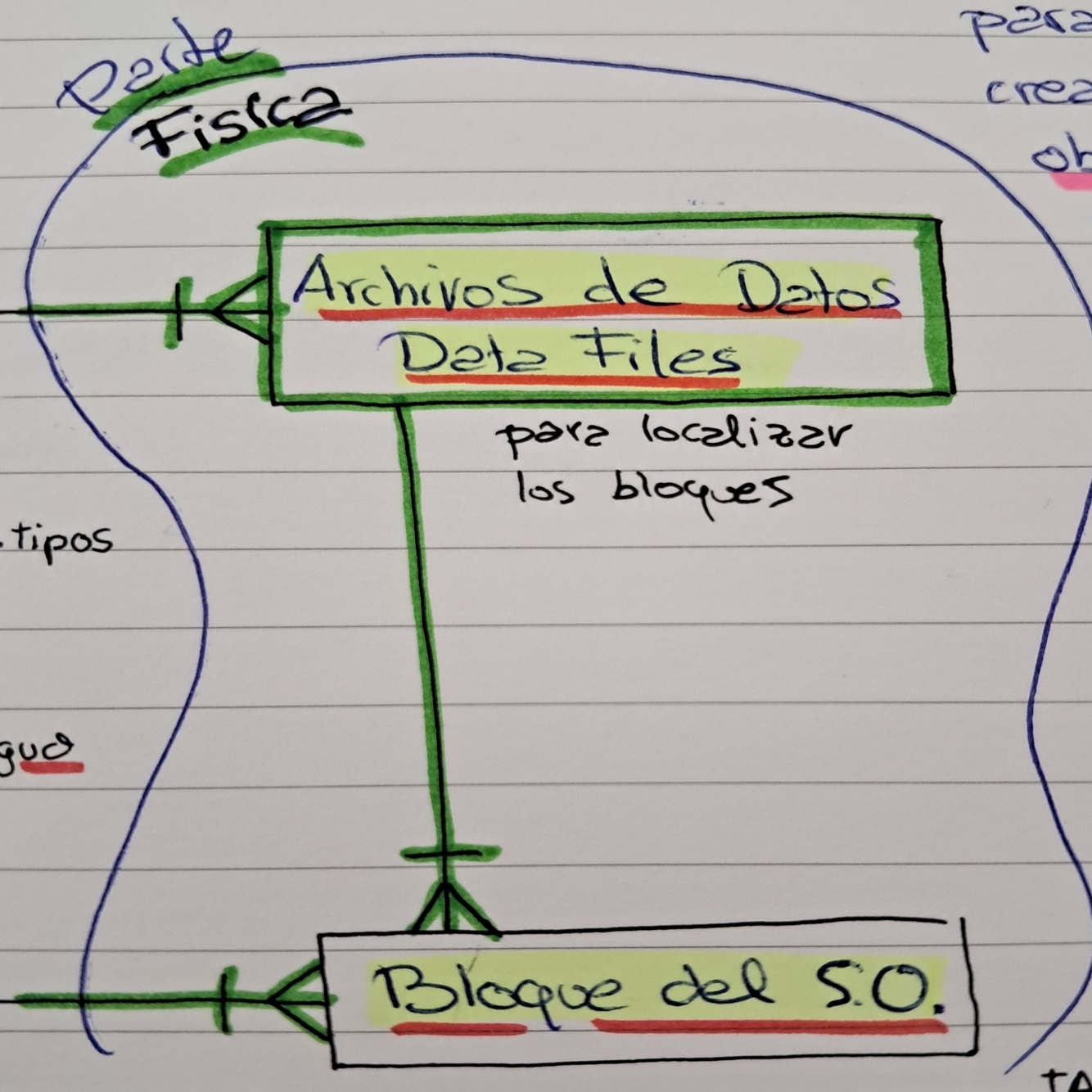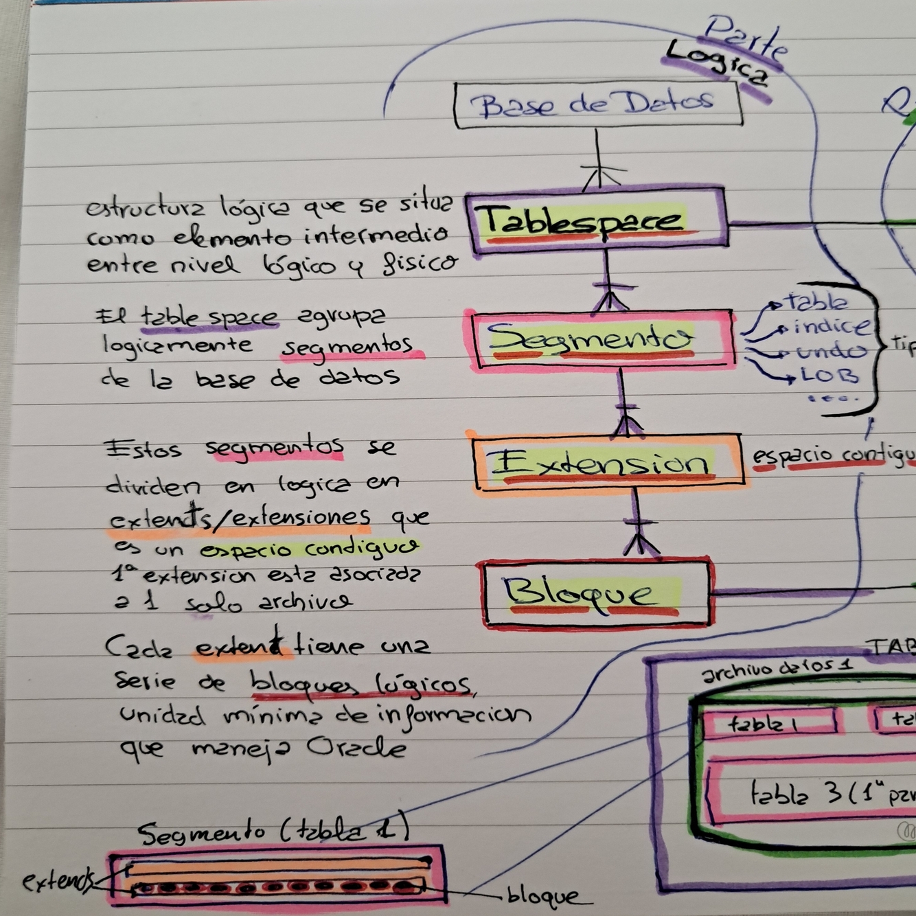 En Table Spaces, que se dividen en Segmentos(tabla, índice, undo…), cada segmento se divide en Extends o extensiones, y cada extensión de divide en Bloques
