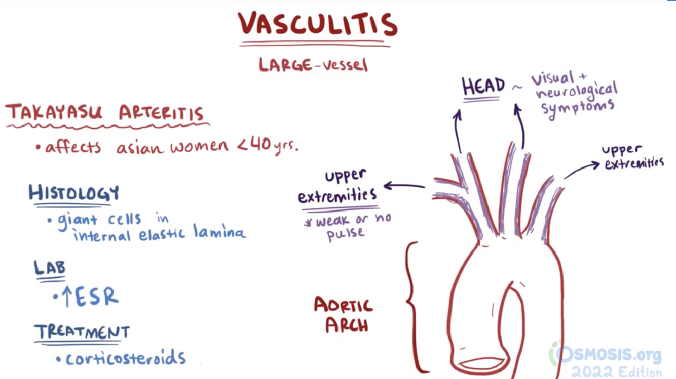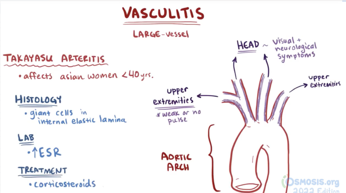 Takayasus arteritis is a form of large vessel arteritis. The presentation is very similar to giant cell arteritis, except for which 2 key differences?