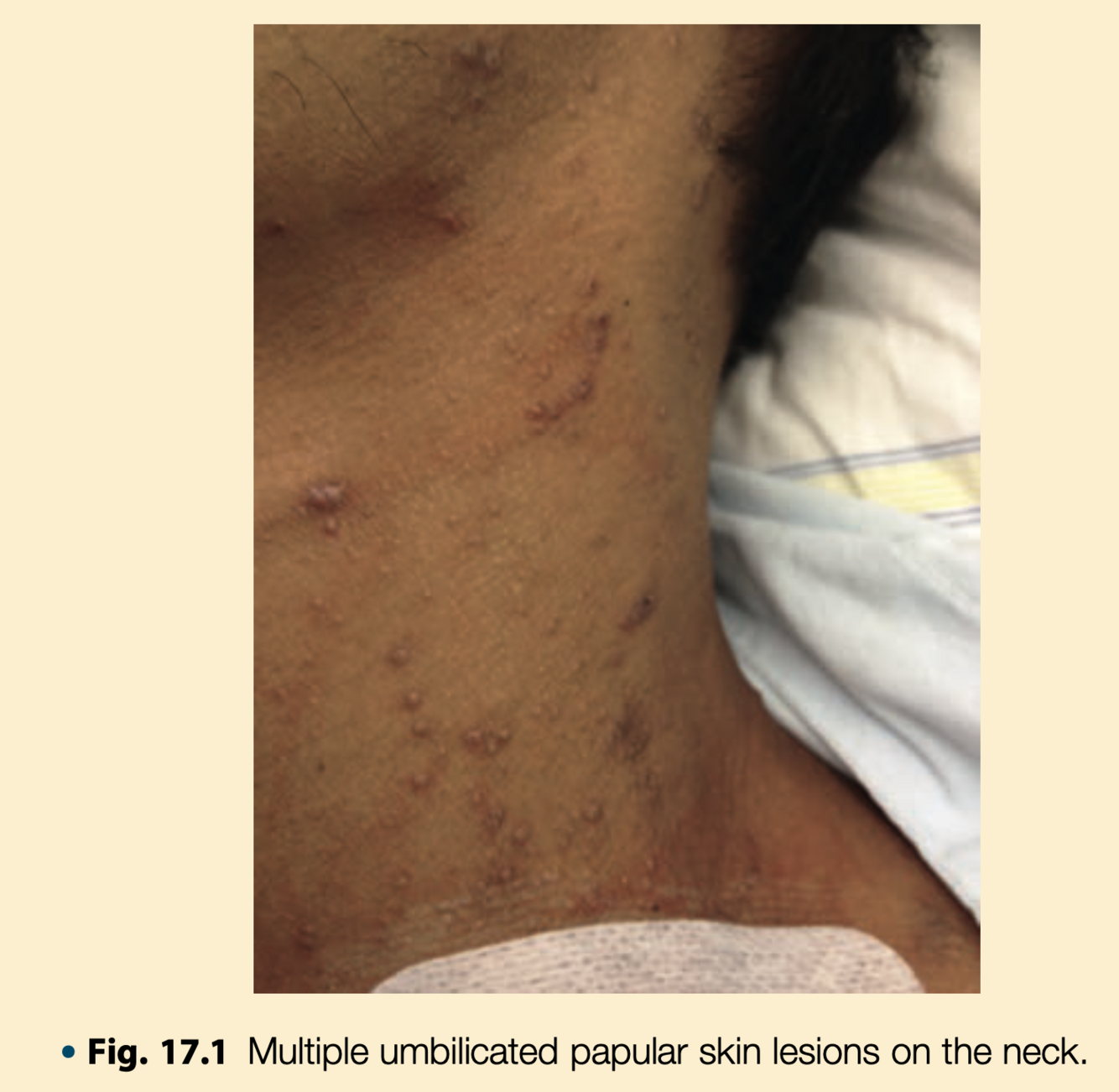 * Umbilicated papular skin lesions typically located on the face and chest and extremities