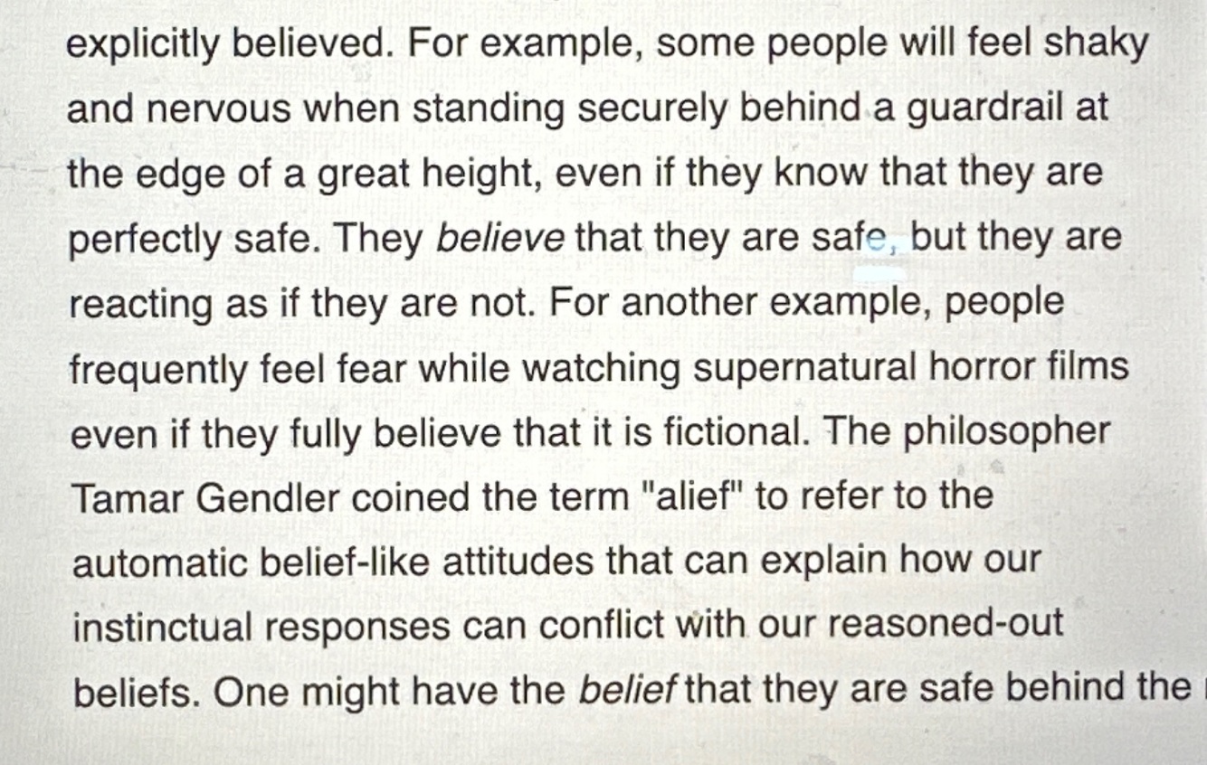 Automatic belief-like attitude that can explain how our instinctual responses can conflict with our reasoned-out beliefs (type of cognitive bias)