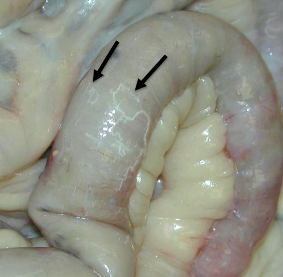 secondary to virulent pathogens that cause necrosis (salmonella and clostridium)