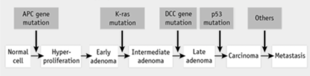 Mutations in the tumor suppressor genes APC and DCC drive the progression of colon epithelial cancer. K-Ras mutation augments proliferation of cells carrying mutations further increase the chances of accumulating additional mutations. P53 is another important tumor suppressor gene and its mutation culminates in the formation of full blown carcinomas, and metastasizing tumors