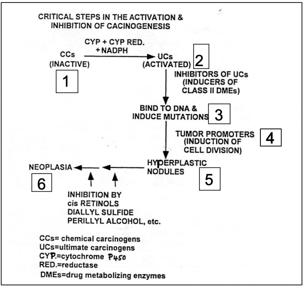 tries to block with cis Retinols, diallyl sulfide and perillyl alochol but if unsuccesful will become neoplasia (cancer)