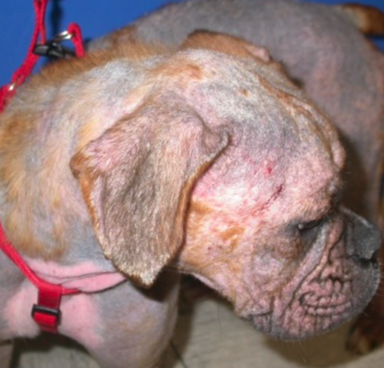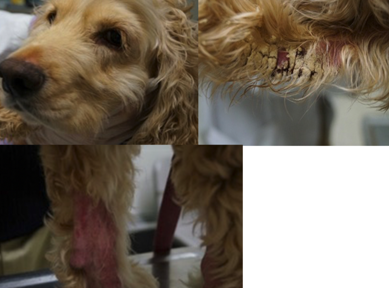 Pete is an 8 month old mixed breed dog. Unfortunately, Pete was attacked by a neighbors dog and had to be euthanized. This is what Pete looked like prior to death. What skin lesions do you see?