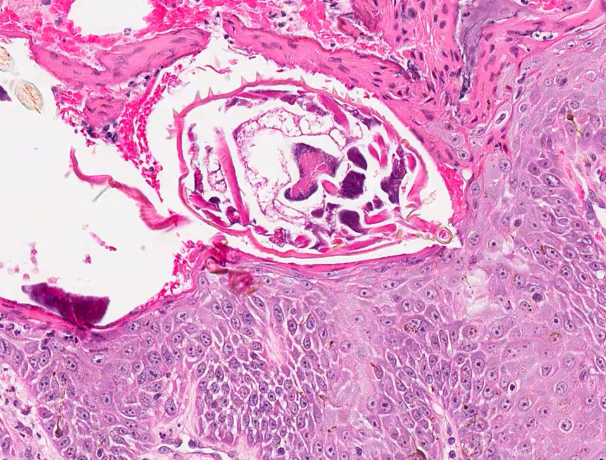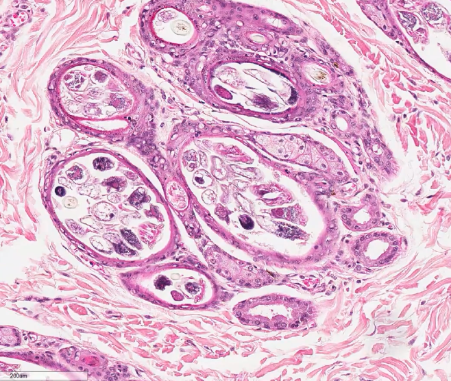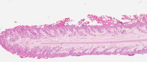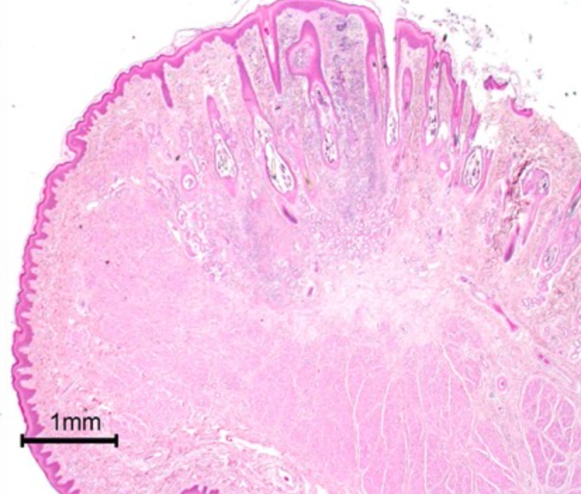 Take a look at section from Leo’s skin. Curiously, can you identify the location? From what structure did the pathologist sample?