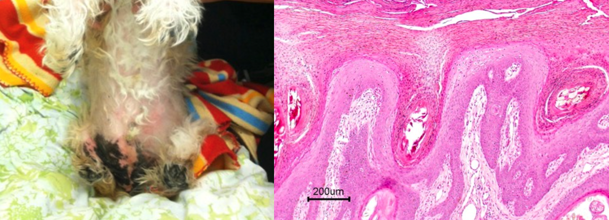 Puggy, 12 yr old MC, Shih tzu, is seen for lameness marked pawpad hyperkeratosis with crusting and erosions. The abdomen is also markedly hyperpigmented. You perform a minimum derm database (skin scrapings, impression smear, etc) and find superficial bacterial infection but you are concerned about a more serious disease. You perform a skin biopsy.