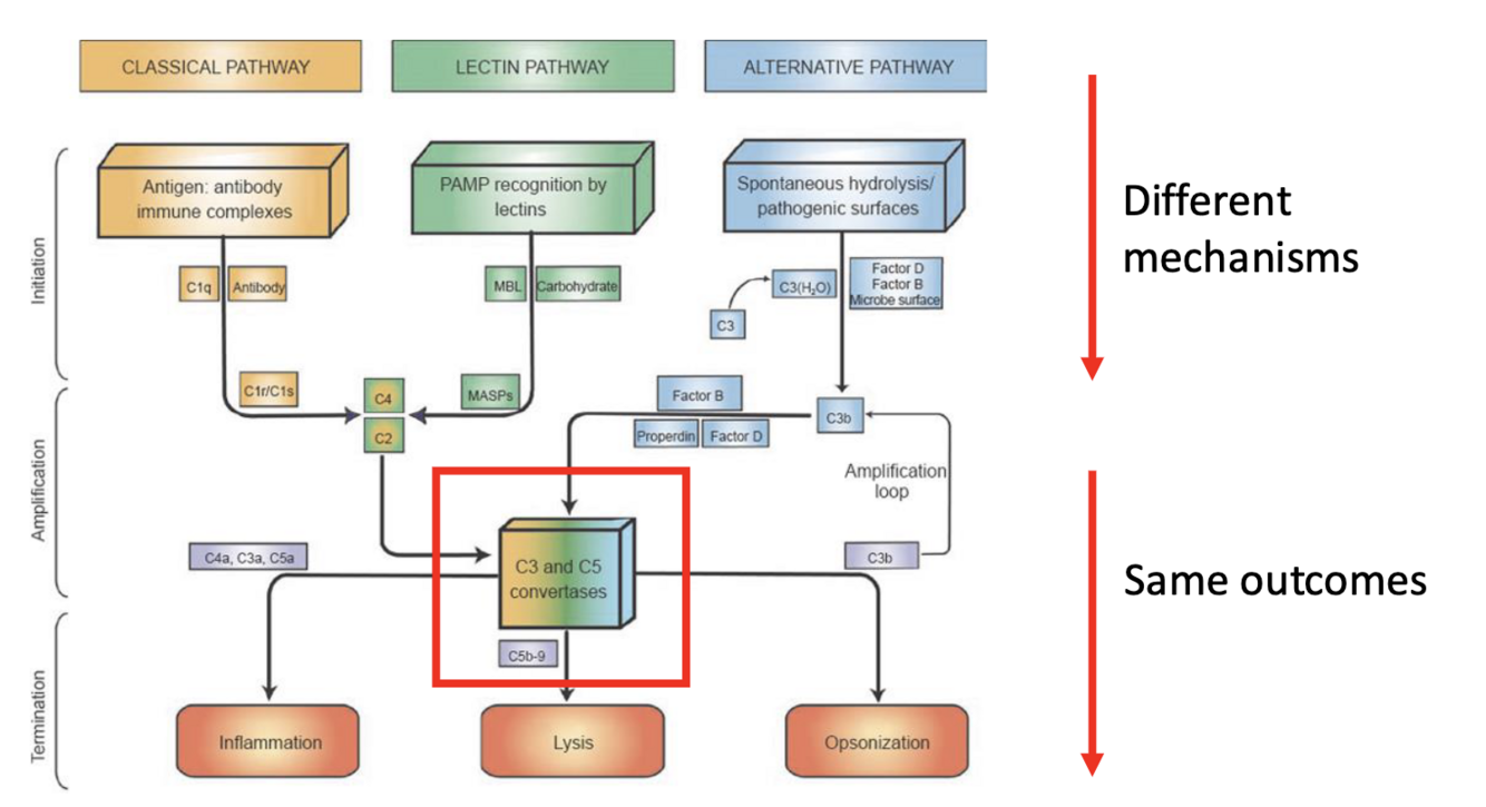 All three pathways converge towars the formation of C3 and C5 convertase enzymatic complexes adn are magnified through this amplification loop
