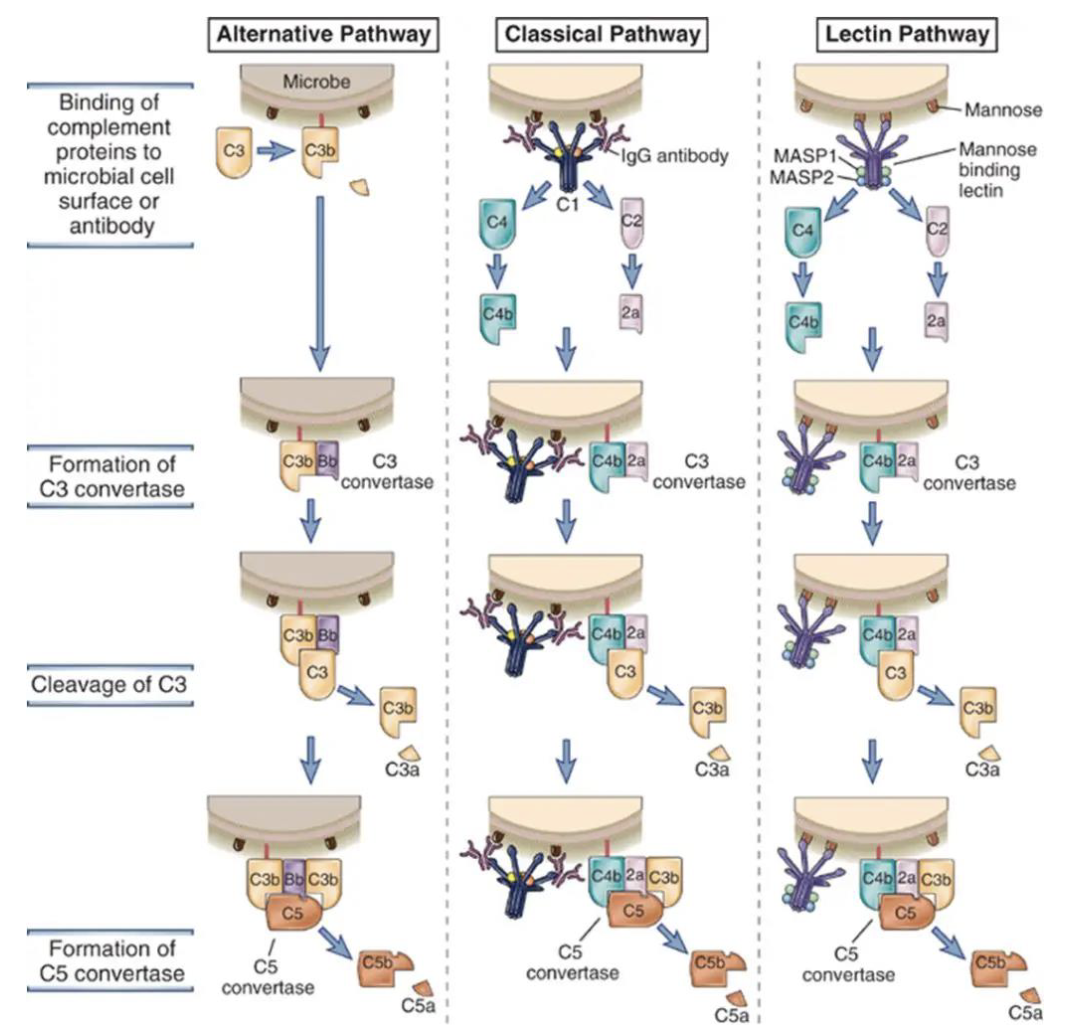 The three pathways converge toward the activation of the C3 and C5 convertases, which are enzymatic complexes leading to a common terminal pathway.