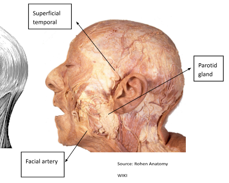 which muscle on the side of the face lies immediately posterior to the facial artery as it enters onto the face?