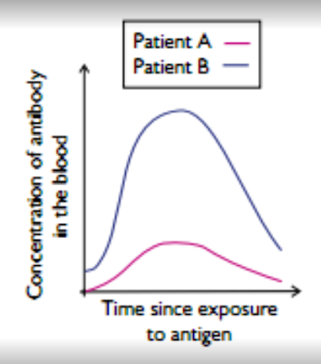 7) The graph shows the concentration of the antibody to a disease in two patients infected with the disease at the same time. Patient B didn’t showany visible symptoms of the disease whilst patient A did. Explain why.