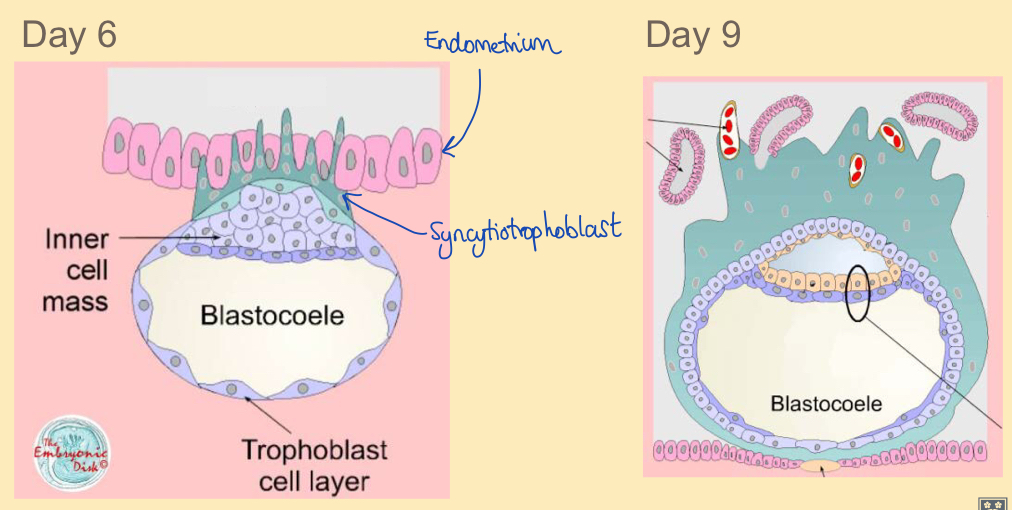 Syncytiotrophoblast cells being the communication with the endometrium at day 6 of pregnancy