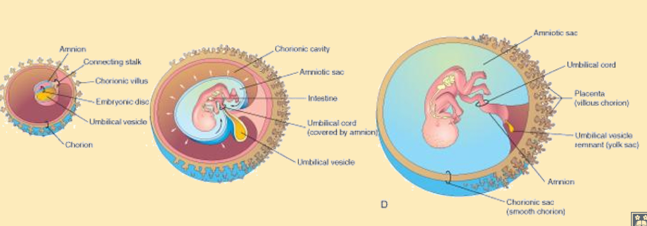 What happens to the yolk sac, amniotic sac and chonrionic sac as the embryo grows?