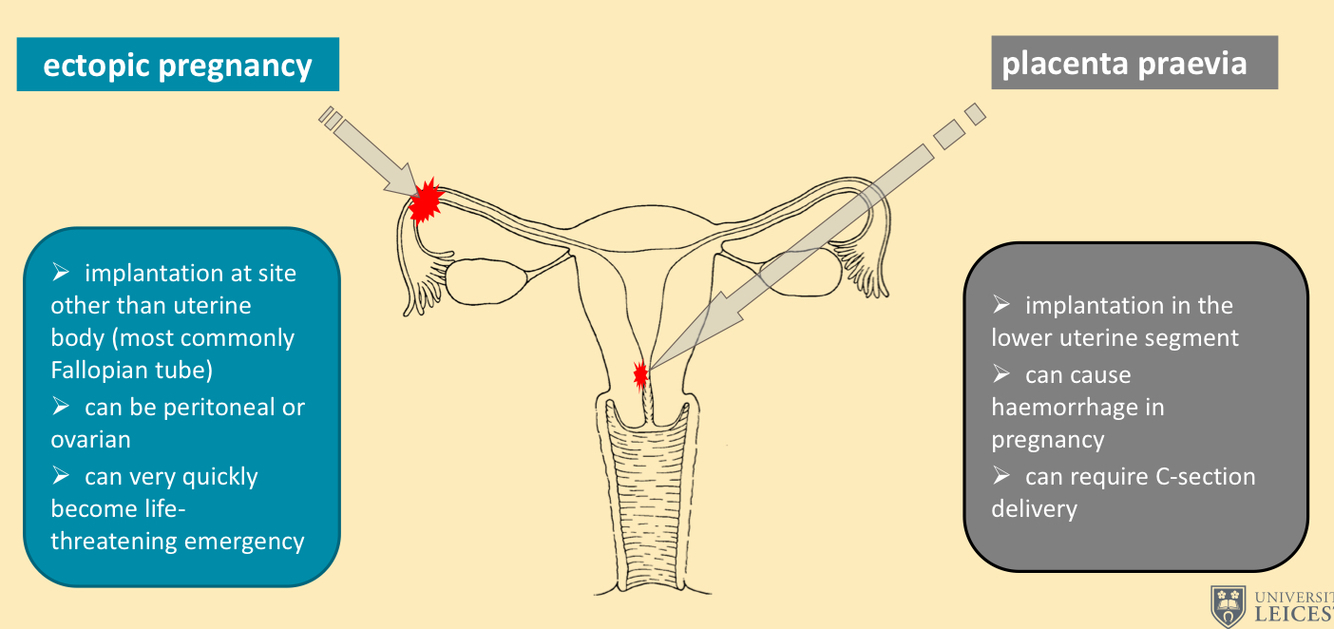 Explain the main principles of ectopic pregnancies and placenta praevia