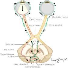 Draw out the pupillary light reflex pathway for light entering the left eye. Label the CNs and nuclei involved.