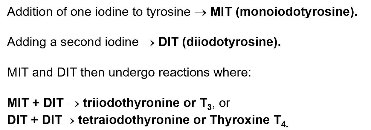 Enzymes catalyse addition of iodide to tyrosinde residues on the thyroglobulin molecule (process in which iodide loses an electron to become iodine)