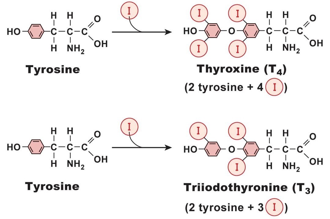 Explain the process of iodide and tyrosine residues forming thyroid hormones?