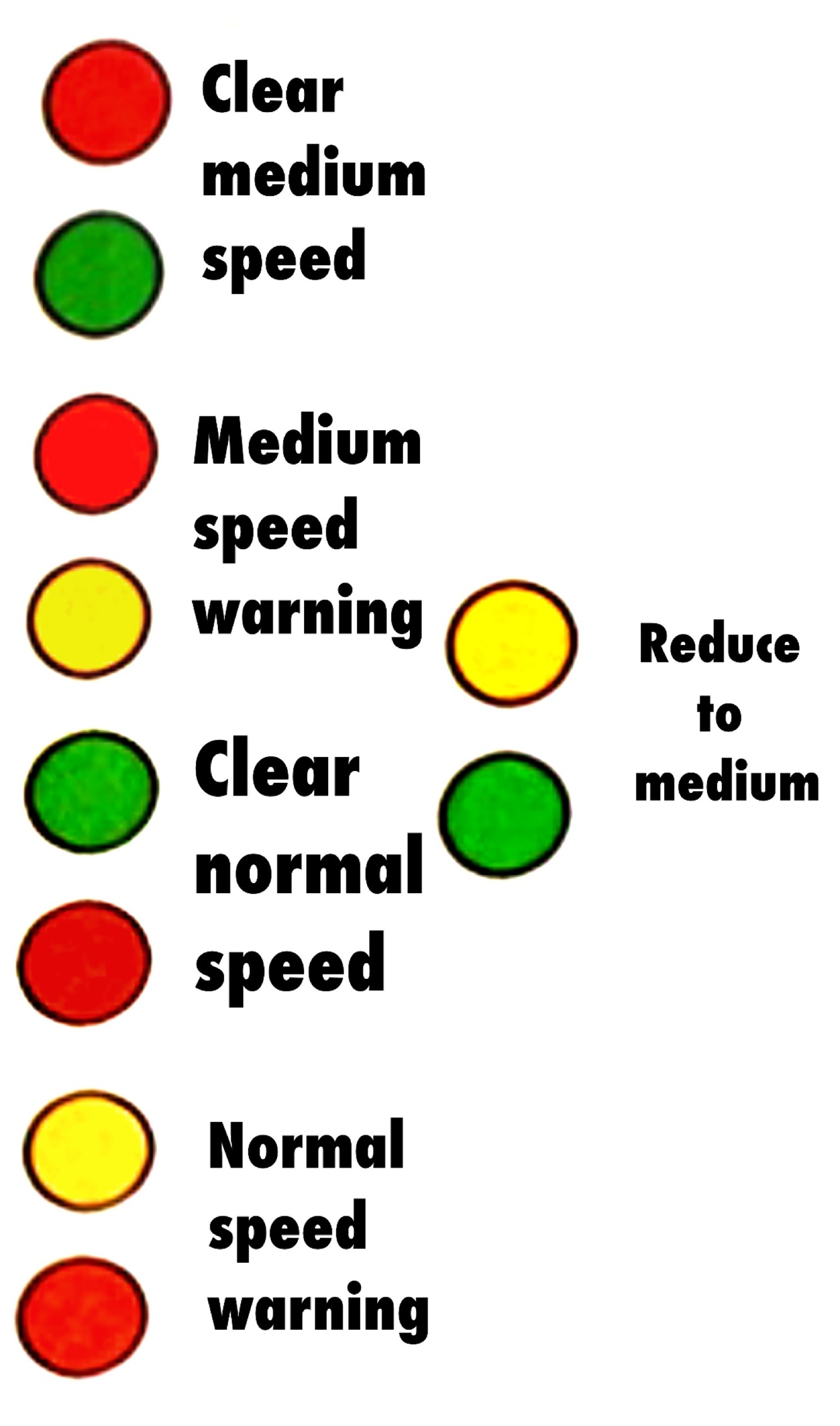 Posted track speed, but prepared to reduce to 40kph by next signal (unless 65 or 80 is indicated)
