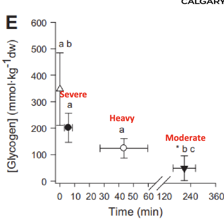 In short: Fatigue at severe intensities is mostly metabolic, at heavy intensities it’s a mix of metabolic problems and energy depletion, and at moderate intensities, it’s mostly due to running out of glycogen.
