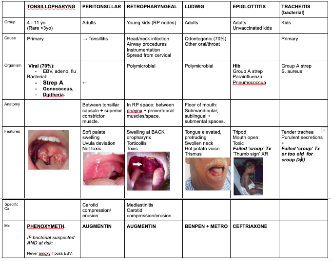 –> Augmentin for quinsy, retroP. PLUS Metro for Ludwig. Ceftriaxone for epiglottitis.