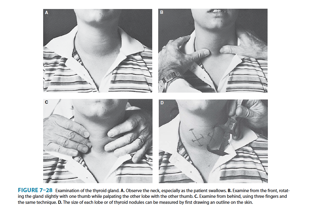 Quelles sont les 3 étapes de l’examen physique de la thyroïde?