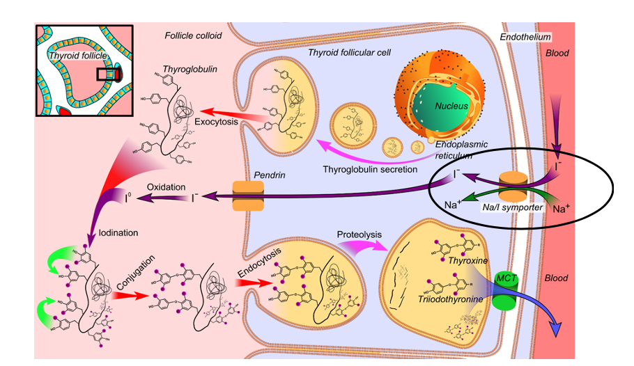 L’iode passe dans le sang et entre dans la cellules folliculaire