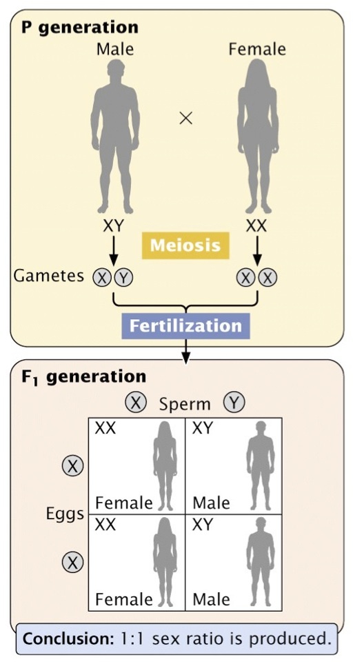 Explain how X and Y chromosomes are separated between male and female during meiosis and through to fertilisation.