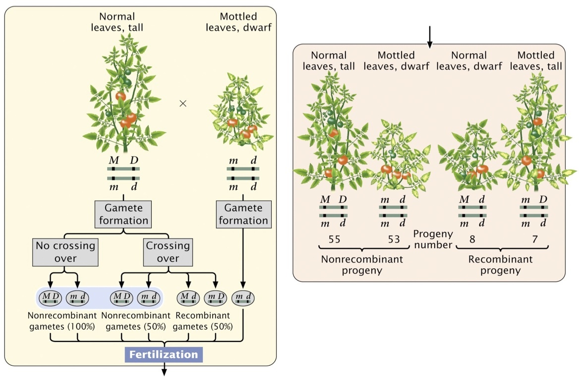 Crossing over between linked genes produces nonrecombinant and recombinant offspring. See example in answers of a diagram.