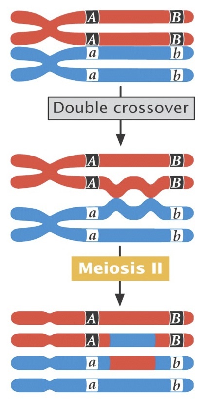 the sorting of alleles on the same chromosome (crossing over), the exchange of genetic material in prophase I of meiosis.