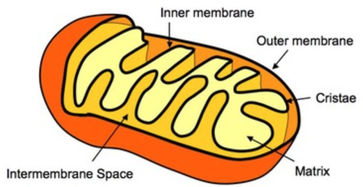 Surrounded by double membrane folded inner membrane forms cristae: site of electron transport chain.