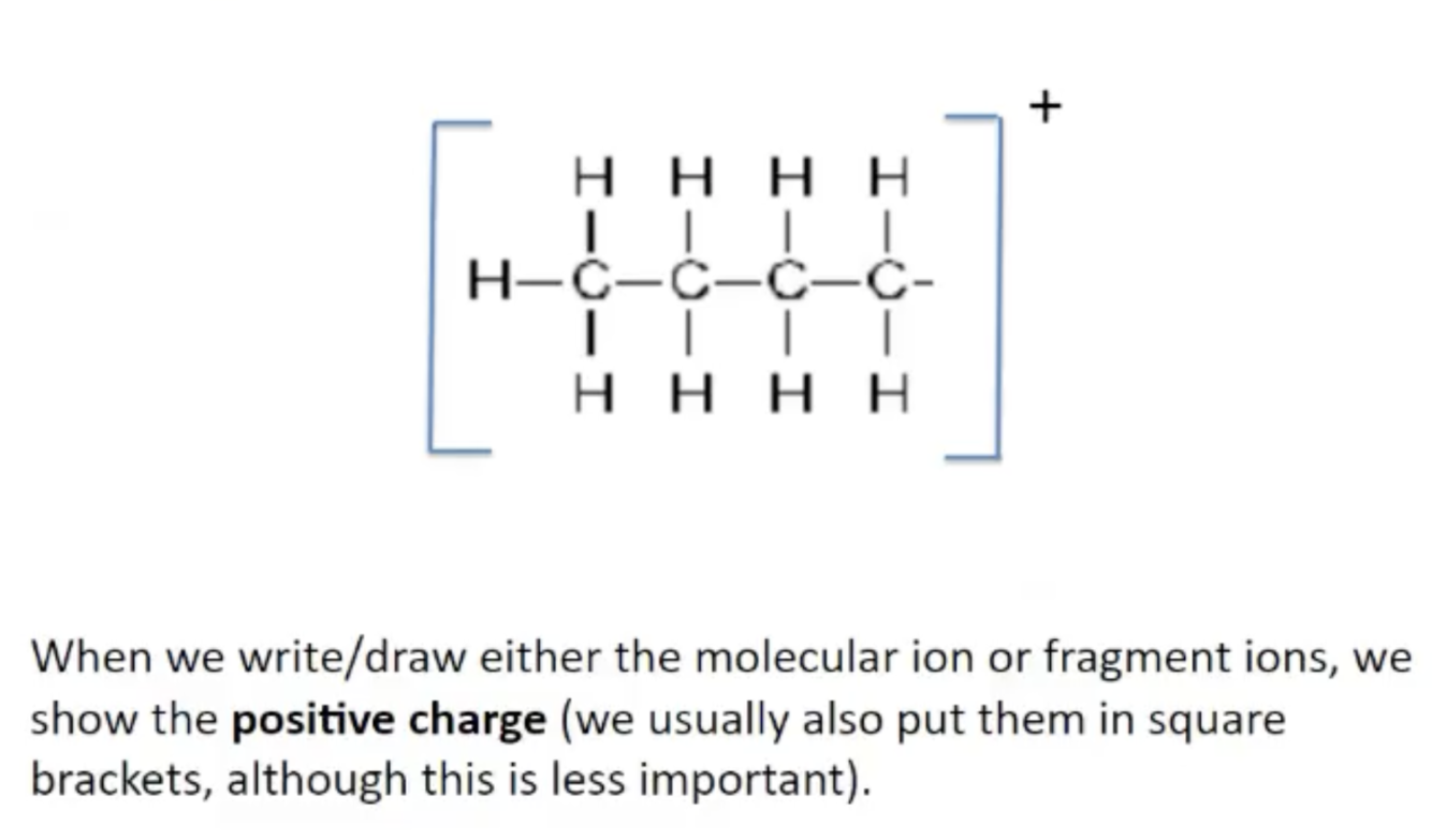 When writing the groups that organic, you must draw a + It doesn’t matter where the positive charge is. Also draw square brackets around fragment ions.