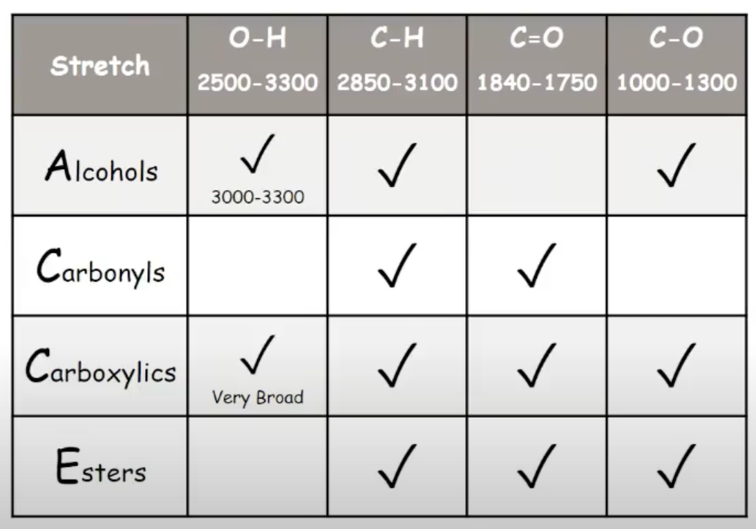 Draw a table to show the peaks you would see for alcohols, carbonyls, carboxylics and esters