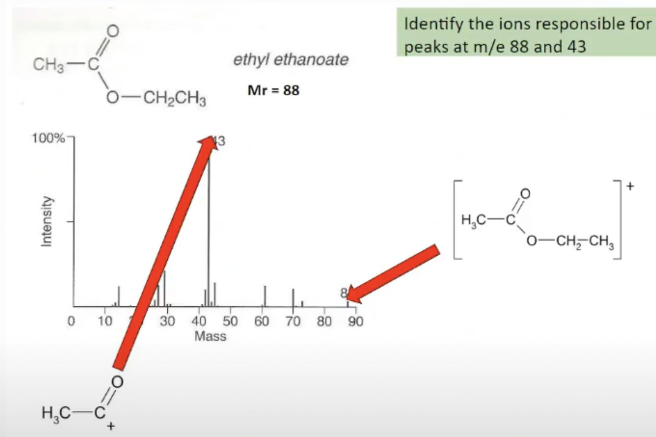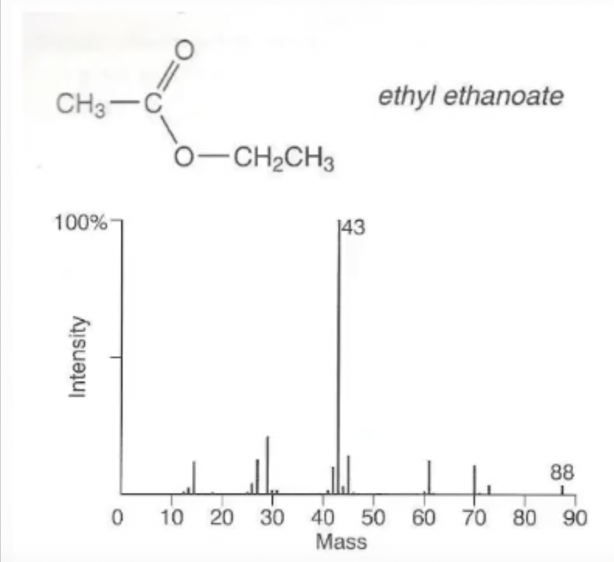 Here is the mass spectra for ethyl ethanoate. Identify the ions responsible for the peaks at 88 and 43