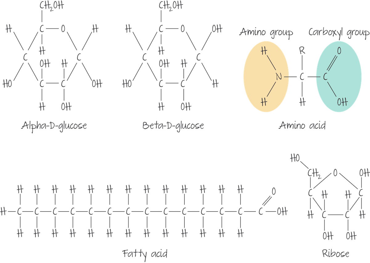 basic structures of glucose, amino acids, fatty acids and ribose.
