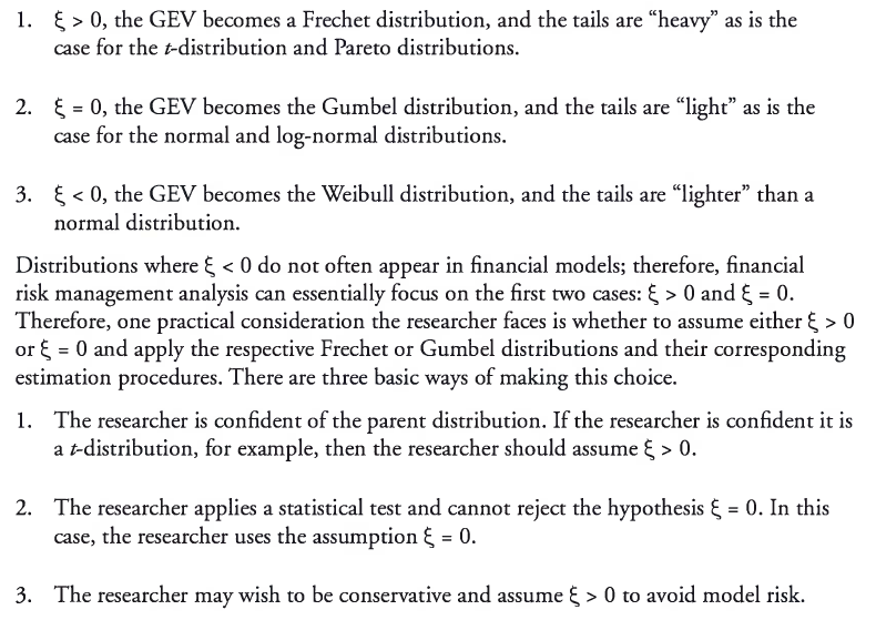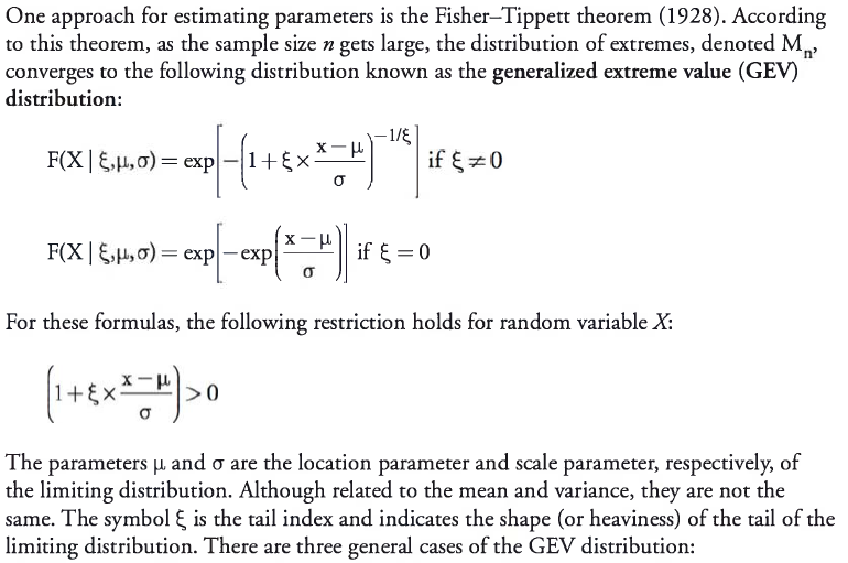 Extreme value theory (EVT) is a branch of applied statistics that has been developed to address problems associated with extreme outcomes. EVT focuses on the unique aspects of extreme values and is different from “central tendency” statistics, in which the central-limit theorem plays an important role. Extreme value theorems provide a template for estimating the parameters used to describe extreme movements.