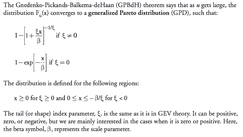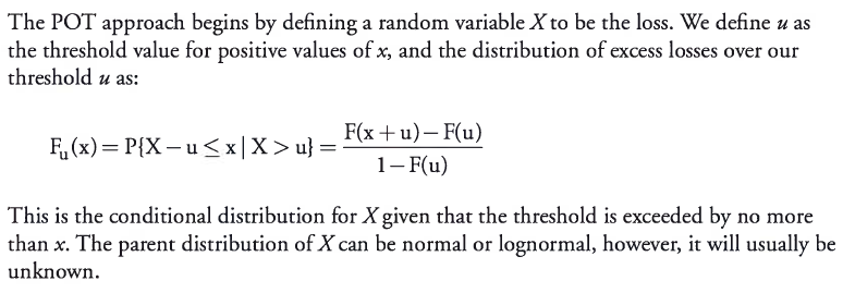 The peaks-over-threshold (POT) approach is an application of extreme value theory to the distribution of excess losses over a high threshold. The POT approach generally requires fewer parameters than approaches based on extreme value theorems. The POT approach provides the natural way to model values that are greater than a high threshold, and in this way, it corresponds to the GEV theory by modeling the maxima or minima of a large sample.
