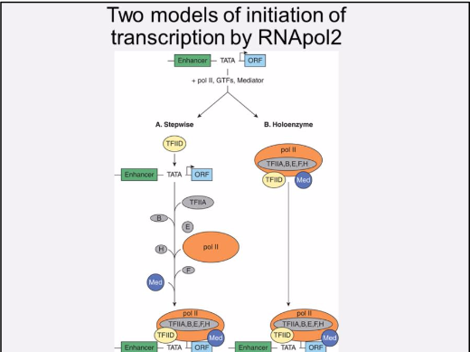 What are the two models of transcrition initiation by RNA pol2?