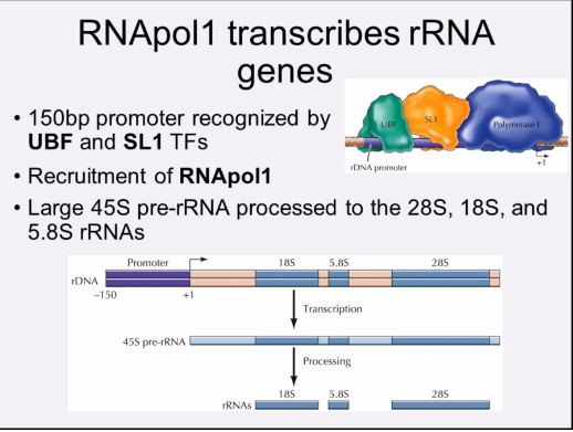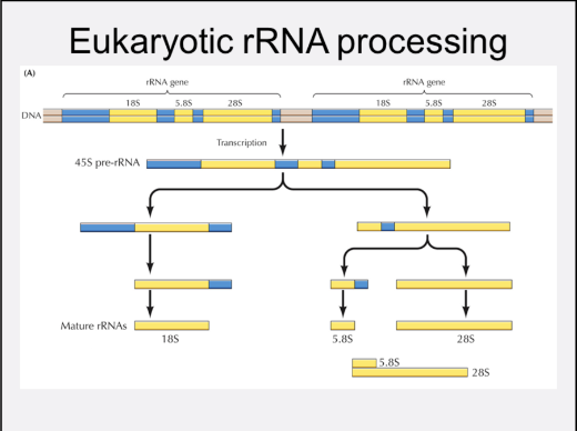 The 5.8S, 18S, and 28S are derived by cleavage of a single transcript.